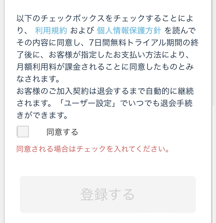 利用規約に「同意する」をチェックし、7日間無料トライアルをクリック