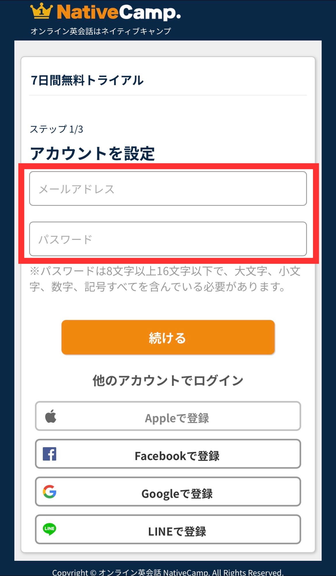 ネイティブキャンプ新規登録画面