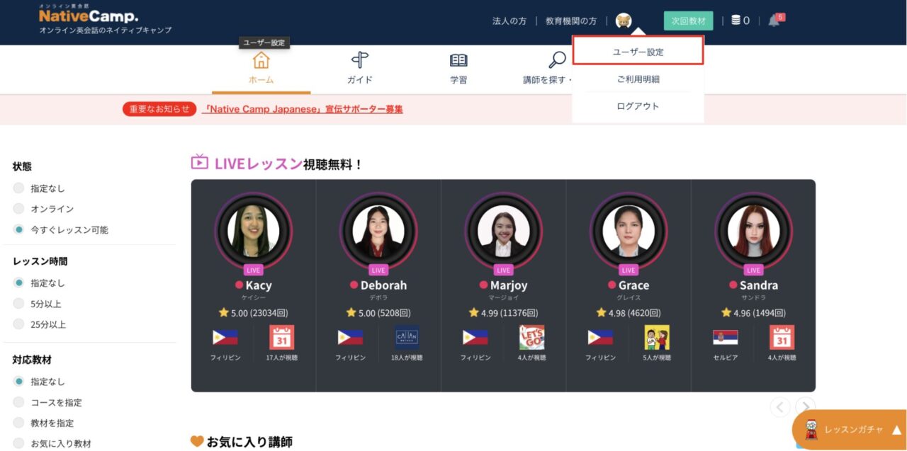 ネイティブキャンプにログイン後、ユーザー設定をクリック